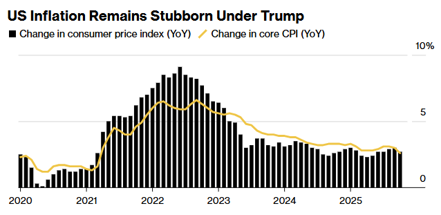 Inflation fell to 2.7% year over year in November, roughly where it averaged for 2025. That is a clear improvement from the peaks of 2022. It is also still above the 2% target of the Federal Reserve.